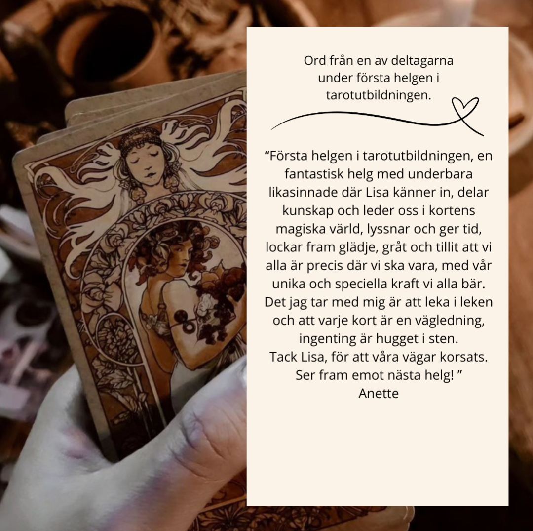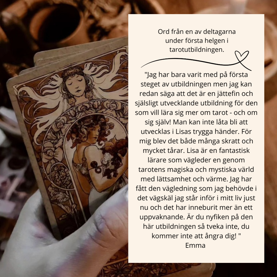 Vi kommer gå igenom bla stora och lilla arkanan, kortens uppbyggnad, rening, vägledning, kalla på dina guider/team, siffror och färgernas betydelse och mycket mer.